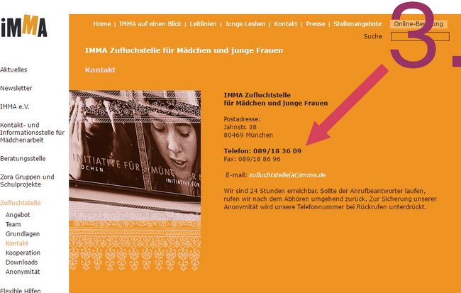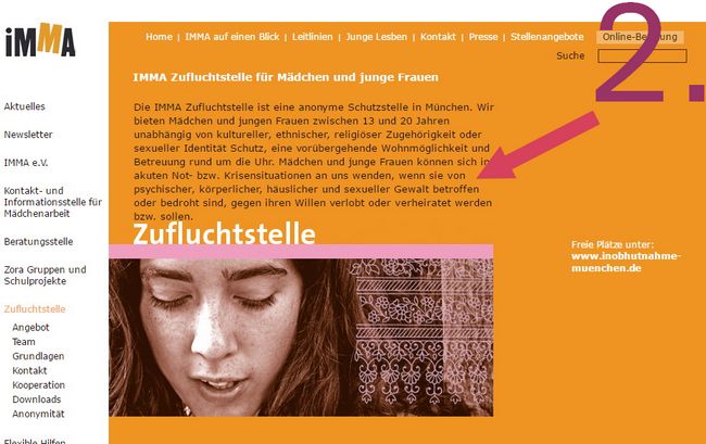 Und wenn ich ein Mädchen wäre, dann würde ich jetzt bei der Seite „Misshandlung bei Kindern“ auf den Link „Initiative Münchner Mädchenarbeit IMMA“ klicken. Daraus geht zwar nicht hervor, um was sich diese Initiative dreht, doch da ich sie schon kenne, weiß ich, dass ich hier richtig wäre. Ich lande auf der Startseite; finde auch dort nicht das Thema Kindesmissbrauch, dafür das vielversprechende Wort „Zufluchtstätte“.