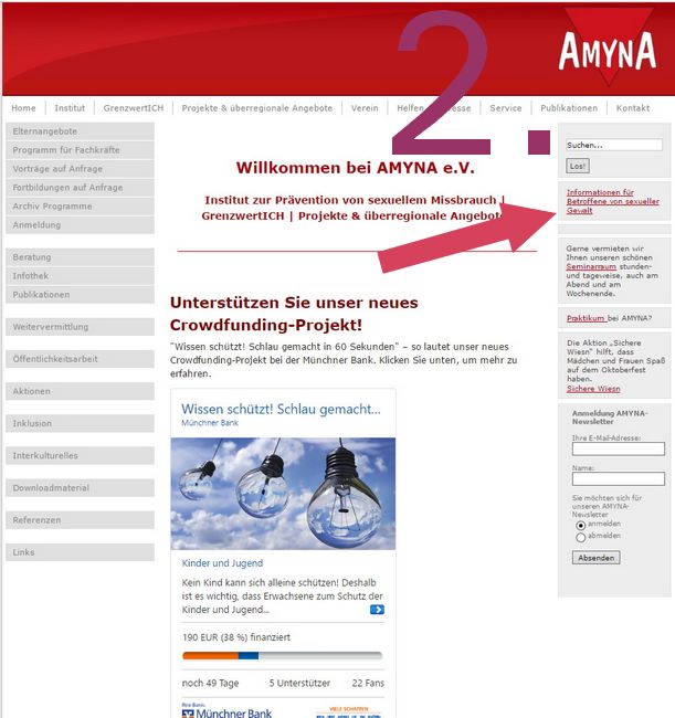 Damit gelange ich auf die Seite von Amyna e.V., dem „Institut zur Prävention sexuellen Missbrauch“ – welch ein Name. Auf dieser Seite sehe ich als erstes „Crowdfunding-Projekt“, was wohl heißt: die Stadt München fechtet bei privaten Spendern um milde Gaben. Doch dann sehe ich rechts oben, recht klein geschrieben: „Informationen für Betroffene von sexueller Gewalt“.