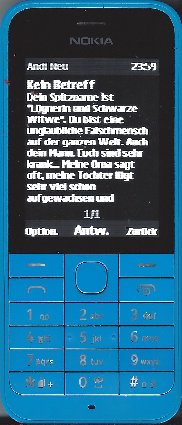 Am nächsten Tag, die Mutter war bereits aus dem Krankenhaus ins Altenstift verlegt worden, erhielt meine Frau eine Kette von SMS, die ausgedruckt vier Seiten Text ausmachten. In ihnen beschimpfte uns unser Sohn und drohte uns an, uns umzubringen. Hierbei wurde er so konkret, dass sich meine Frau seitdem vor ihm fürchtet und ich sie bei den Besuchen im Altenheim begleiten muss, da sie vor einem Zusammentreffen mit ihm bange ist.