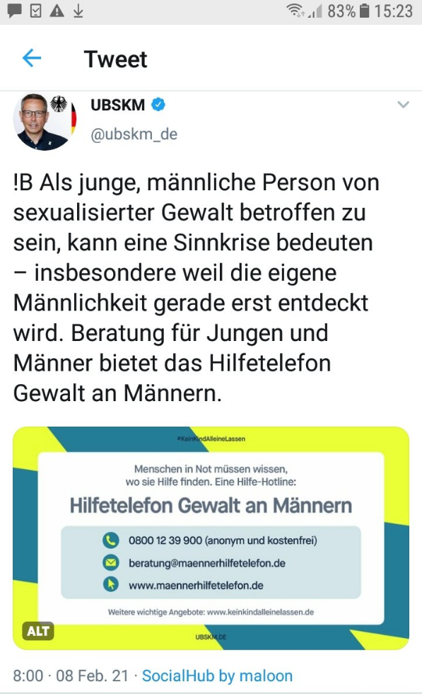 Egal, ich weiß, der UBSKM schreibt seine Tweets ebensowenig selbst, wie es Donald Trump tat. Er hat hierfür seinen Pressestab oder den seiner Ministerin „Dr.“ Giffey im „Familienministerium“. Das heißt, die „Twittersklaven“ dürften feministisch aufgestellt sein und von Männerproblemen keine Ahnung haben. Seine Inkompetenz hatte der Pressestab zuletzt ausdrücklich mit der Broschüre (siehe Link) „Gleichstellungspolitik für Jungen und Männer in Deutschland“ kundgetan, indem er Jungen und Männern empfahl, ihre patriarchale Dividende zu genießen und einfach mal die Klappe zu halten. Sprich sie sollten auch in Fragen von Gewalt gegen Männer schweigen und die Frauen zu Wort kommen lassen. Was sie mit diesem Tweet einmal mehr taten.