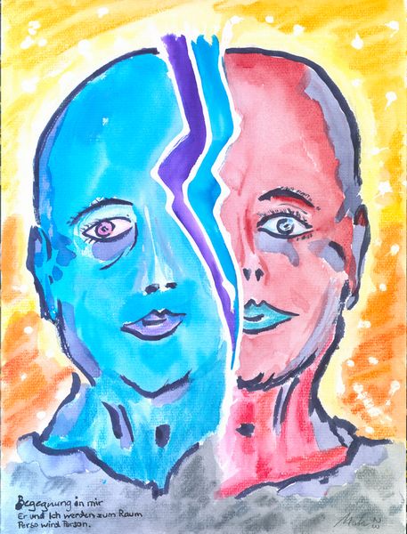 Ich beschreibe M.R., wie ich mich in mir wohlfühle. Wie sich in mir Er und Ich für den Moment finden. Ich spüre der Harmonie nach, die in mir anklingt. Beide Momente meinerselbst bilden für mich spürbar einen Raum. Ich assoziiere dieses Empfinden damit, wie ich mit Dagmar schwinge. Unsere Beziehung ist für mich ein Raum. In dem durchaus auch unterschiedliche Resonanzen schwingen können. Dennoch bleibt er unser Raum, durch den wir wesen und uns ausdrücken. Er basiert auf gegenseitigem Respekt. Hier dürfen wir uns zeigen; wagen es, uns voreinander zu zeigen, wie wir sind; müssen nicht zueinander Masken sein, sondern entblößen uns buchstäblich. Mir kommt das biblische „und sie erkannten einander“ in den Sinn. Sich sehen dürfen und wollen wie man ist. Das ist ankommen.